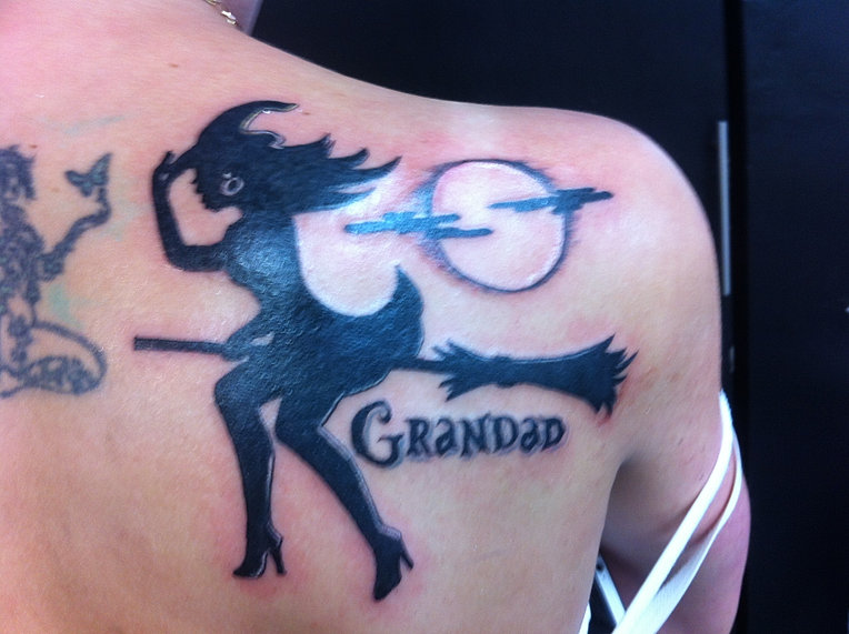 Here is another great outline tattoo, but this one is a lot bigger, and has the witch riding her broomstick with a big full moon in the background.